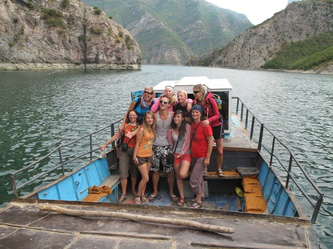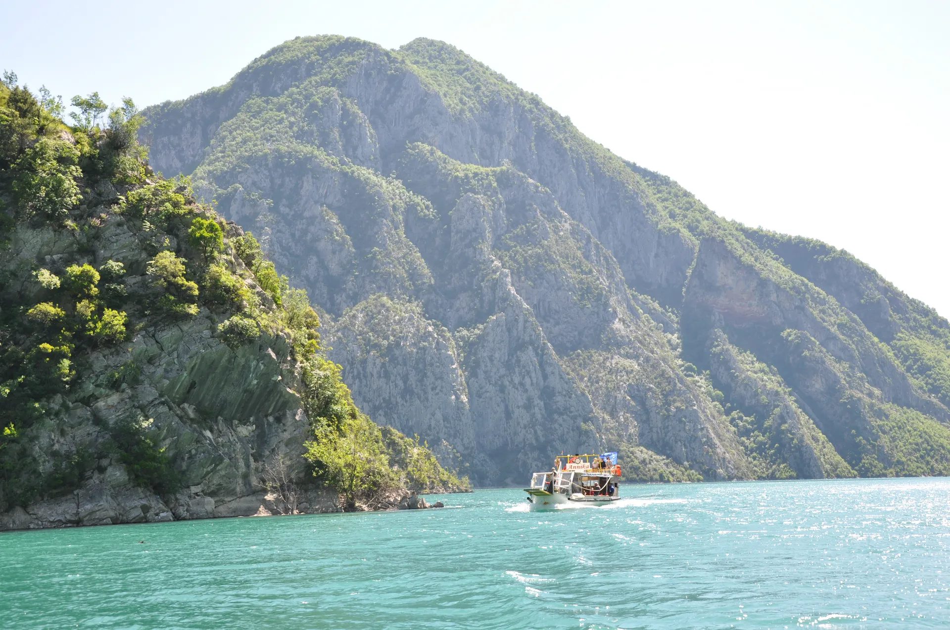 Tour boat navigating the towering limestone cliffs of Koman Lake, often called the 'Thailand of Albania'.