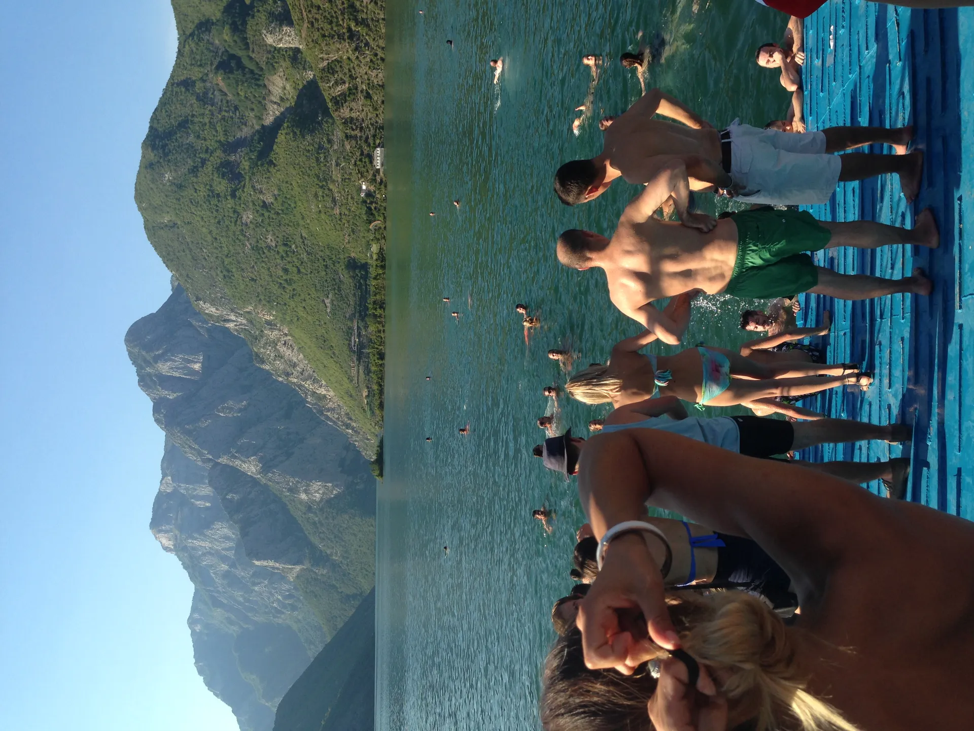 Tour guests taking a break to enjoy a refreshing swim in Koman Lake with a stunning view of the mountains.
