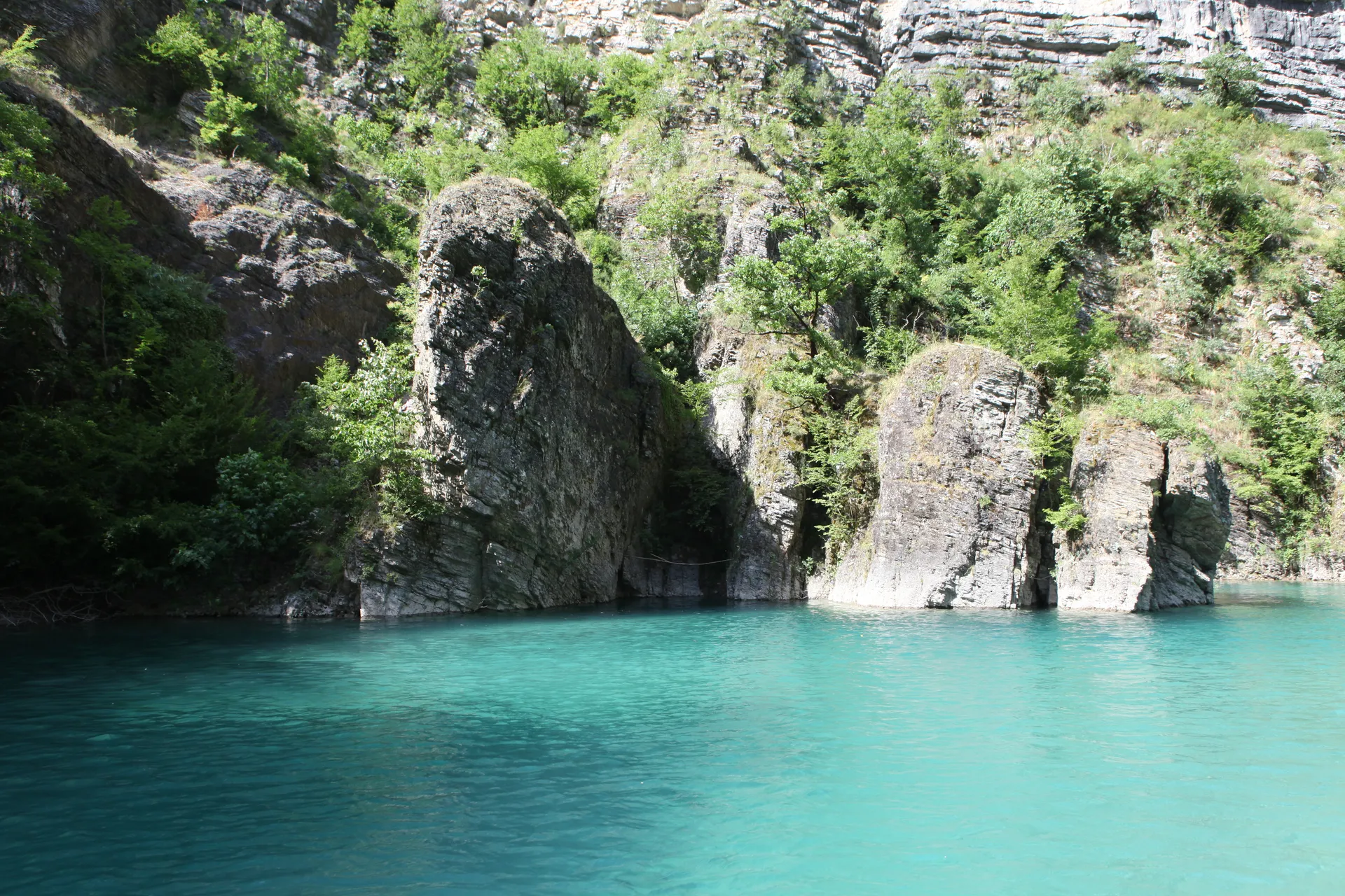 Tranquil turquoise waters of the Shala River flanked by sunlit green canyon walls.